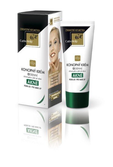 CutisHelp konopný krém Akné denný je dezinfekčný, antiseptický a výživný krém pre pravidelné ošetrenie tváre, celého tela pri akné a je predovšetkým vhodný pre denné ošetrenie. Napomáha vyhladiť, vysušiť, vyčistiť pleť, odstrániť komedóny (upchaté vývody mazových žliaz) a rýchlo sa vstrebáva. Pri dlhodobej aplikácii znižuje produkciu kožného mazu a vznik trudovitej pleti. Obsahuje olej (10% hmotnosti krému) zo semien technického konope (obohatený vitamínmi A, C, D, E) s prirodzenými protialergickými, protibakteriálnymi, protizápalovými vlastnosťami a filtrom UV žiarenia, bielou vazelínou a kyselinou azealovou. Je bez parabénov, psychotropných, návykových a ďalších neprirodzených chemických látok a syntetických prímesí, nie je parfémovaný.